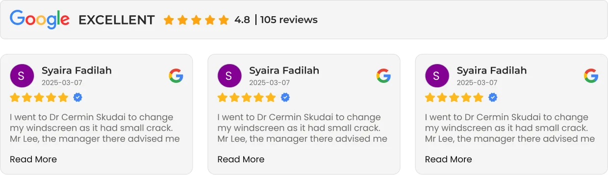 We understand that life gets busy. That’s why Dr. Cermin brings the workshop to your doorstep. Available in Johor Bahru (Southern), Selangor (Central), and Negeri Sembilan (Central), our mobile service team can repair or replace your windscreen at your home, office, or any convenient location. (Dungun, Ipoh, JB, Selangor and KL)